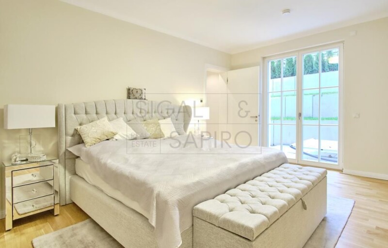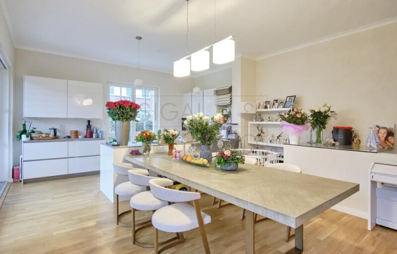 The apartment on offer is located on the ground floor of a luxurious urban villa built in 2018. It is a 6-room apartment with approximately 379 m² of garden for special use, as well as living space in the naturally lit basement. The apartment features a living and dining room with an open kitchen and access to an approximately 36 m² terrace and the south-facing garden, two bedrooms, a bathroom, and a utility room on the ground floor. The basement features two bedrooms with en-suite bathrooms, a dressing room, and a studio. The property is located in one of Berlin's most exclusive residential areas. Excellent shopping opportunities can be found around the nearby Roseneck district. Daycare centers and renowned schools are within walking distance. Numerous green spaces and parks, as well as the nearby Grunewald forest with its chain of lakes, the famous hunting lodge, and the largest dog walking area in Europe, offer a high level of recreational value. Berlin's most exclusive tennis club, Blau-Weiss, is located in the immediate vicinity. From Schmargendorf, you can reach the City West and Kurfürstendamm with its luxury shops, numerous cafés, and restaurants in just a few minutes. Furthermore, you have excellent transport connections to Berlin's government district, Berlin airports, the main train station, as well as Potsdam and the surrounding area with its diverse and varied excursion options. - Approx. 379 m² garden and terrace facing south - Electric awning - Oak parquet flooring - High-quality fitted kitchen - High-quality tile or natural stone floors in the bathrooms - Sanitary ceramics and fittings from renowned manufacturers - Sauna in the basement - Underground garage with XL parking spaces - Elevator - Underfloor heating - Energy source: air-to-water heat pump supported by solar thermal energy - High security standard, alarm system - Large communal garden with children's playground. Final energy consumption: 31.10 kWh/(m²·a).
