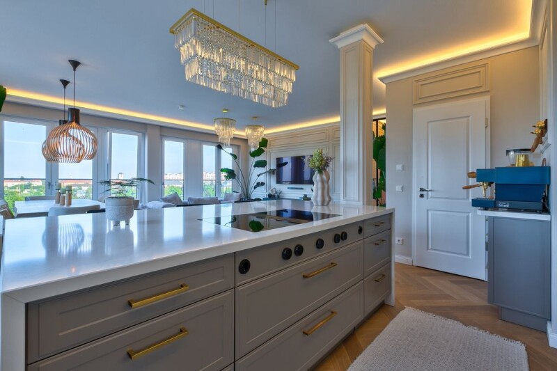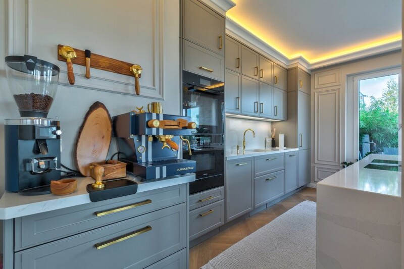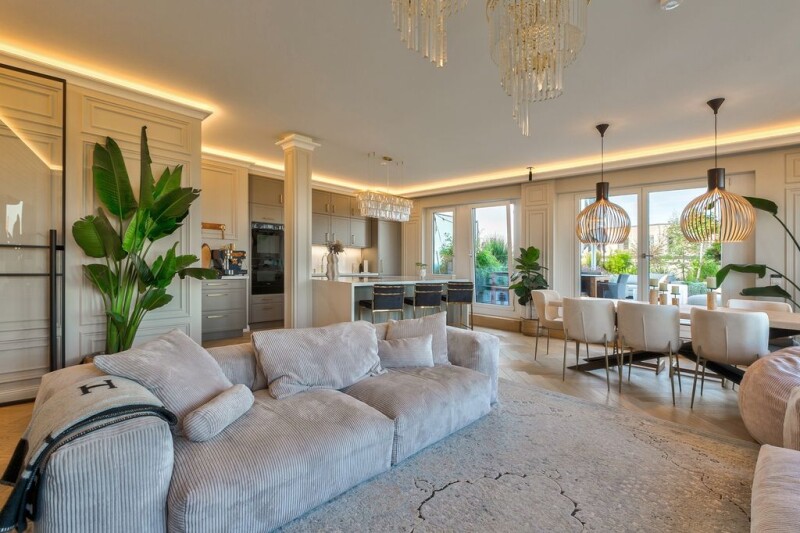 Exclusive designer terrace apartment with a panoramic view of the countryside Located between the magnificent Kurfürstendamm boulevard with its high-end boutiques and the representative residential areas of Grunewald and Dahlem, Schmargendorf fits perfectly into the characteristic cityscape of these highly attractive residential areas. Like its noble neighbors, the district that belongs to Charlottenburg-Wilmersdorf has a growing inventory of well-kept old buildings, stately country houses and spacious villas. In Schmargendorf you can live comfortably and comfortably: Breite Straße as the center of the town offers everything you need and could wish for in casual elegance with its long-established shops and modern specialist shops. The listed Kreuzkirche on Hohenzollerndamm is also worth a visit, as is the sports and health park on Lochowdamm, the outdoor swimming pool of the same name and the world-famous ice rink at the Wilmersdorf stadium. In Schmargendorf people live together and love peace and quiet. If you're looking for metropolitan variety and exciting entertainment, you can reach all other places in the city in no time using the S-Bahn or subway and six different bus lines. All other areas of Berlin can also be reached quickly and easily by car, such as the lively and exciting neighboring districts of Charlottenburg and Schöneberg right next door. This real estate offer is an exclusive terrace apartment in the representative Maximilian Quarter. This was done in 2018 on a circa. 4.7 hectare property was built between Grunewald and Kurfürstendamm. The new building complex has a modern design, with thermally insulated plaster facades, and has a modern underground car park with parking spaces and a large cellar compartment. The apartment also impresses with a custom-made fitted kitchen, which perfectly complements the living-dining area. This opens onto a spacious terrace with a breathtaking 180 degree view of the surrounding area. The apartment also has two loggias with a southeast orientation, which offer ideal space to relax and enjoy the sun. Furthermore, the apartment impresses with a continuous window front with a southeast orientation. The spacious master bedroom area is equipped with a custom-made dressing room. The entire apartment is equipped with a lighting concept that is second to none. There are very high-quality natural stone materials and oak parquet in a herringbone pattern throughout the residential unit. Overall, materials, surfaces and craftsmanship are of exquisite quality in this property. Two underground parking spaces, each of which can be purchased for €70,000, complement this real estate offer. • 6 rooms • 5 bedrooms • Granny flat of approx. 60 square meters (see floor plan) • Exquisite Nolte fitted kitchen with Bora and Miele appliances as well as a kitchen island • 3 bathrooms, 2 of which are full baths and 1 shower room • High-quality fittings from Grohe • Dressing area in the bedroom • Utility room with dryer, washing machine and practical built-in cupboards • Various custom-made built-in cupboards in the entire apartment • Oak parquet in herringbone look and underfloor heating • Ceiling height approx. 2.80 meters • Floor-to-ceiling windows • Electric blinds • Terrace with 180 degree view, 2 loggias facing southeast • Video intercom system • Passenger elevator • 2 cellar rooms • Bicycle storage room • 2 underground parking spaces (optional).