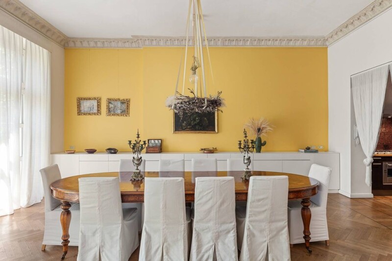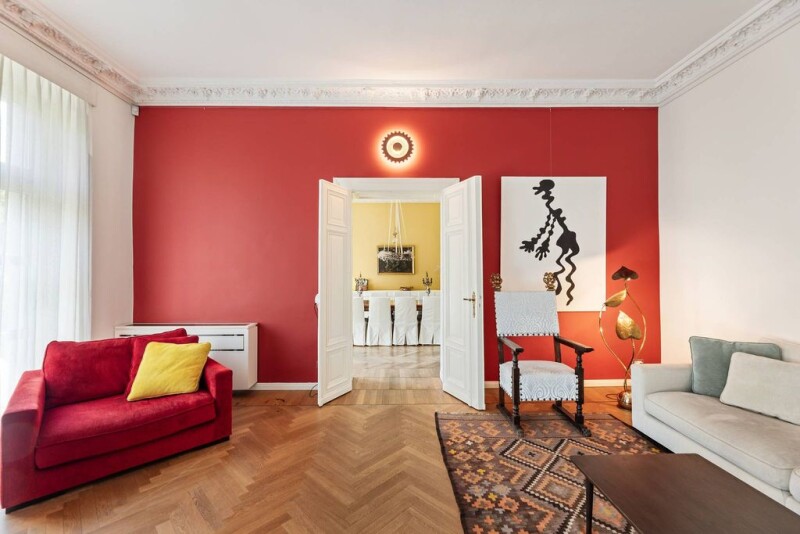 Discover your new home in this magnificent flat, which appears stately with its impressive 3.60 m high stucco ceilings and a total living space of 189 sqm. This apartment is perfectly designed for a family with children and has five well-sized rooms, including three bedrooms. A particular highlight are the two bathrooms, which significantly increase everyday comfort. The first bathroom is luxuriously equipped with a bathtub and a shower, while the en-suite bathroom to the master bedroom has an oversized shower and a window. The extensive open living spaces (living room and dining area) are characterised by their spaciousness and floor-to-ceiling patio doors, which provide access to an inviting balcony. This outdoor area is perfect for enjoying the urban atmosphere or spending a relaxing evening outdoors. The flat is centrally located and thus combines urban life with the desire for a spacious and sophisticated living ambience. The furnishings and comfort of this flat ensure that it meets the needs of a modern family in every respect. We cordially invite you to come and see the advantages of this exceptional property for yourself during a personal viewing. Experience how your new home combines style, comfort and functionality in a unique living atmosphere.