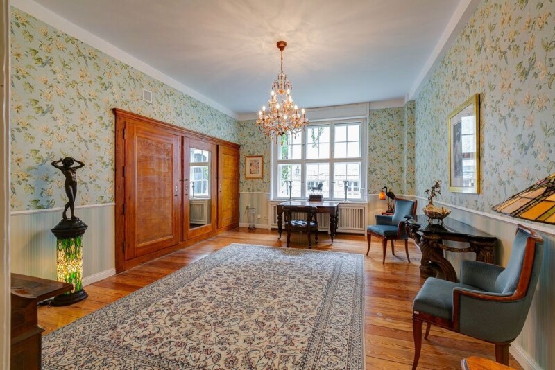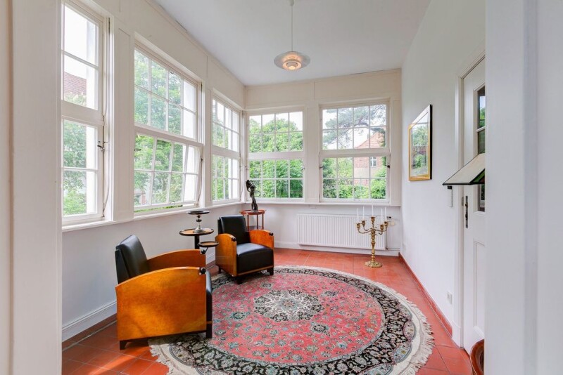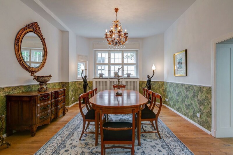 Luxurious multi-generation house under monument protection in Nikolassee Nikolassee belongs to the Steglitz-Zehlendorf administrative district - and one of the least populated districts of Berlin. A mere 800 inhabitants per square kilometer live in the district, which was founded as a villa colony in the first decade of the 20th century. Right on the 5.6-hectare lake of the same name and around the Nikolassee S-Bahn station, life is spacious, spacious and completely relaxing. Whether on the Rehwiese or on the prominent island of Schwanenwerder, whether in the garden city of Düppel, on the Schlachtensee or along the Spanish Allee - living in Nikolassee embodies largely untouched nature, fresh air and lots of water. Although Nikolassee is secluded in the extreme southwest of Berlin, it is anything but backwoods: the Schlachtensee student village, the Wannsee lido and many monuments are evidence of great popularity, internationality and cultural authenticity. Various local public transport bus lines and the S-Bahn conveniently connect Nikolassee with the other districts of Berlin. With the S7 in the direction of Potsdam HBF or the S1 in the direction of Wannsee, you can reach Wannsee in around 2 minutes. You can reach City-West with the S7 in about 12 minutes and Berlin Central Station within 25 minutes. The city center of Berlin can be reached just as quickly by car via the Potsdamer Chaussee, which is designated as a federal road, or via the A 115 motorway, which - entered on the Potsdamer Chaussee - is also known as AVUS on this section. This historic property is a representative villa in Nikolassee from 1914. It was built by the architect Heinrich Straumer, who is also responsible for the Berlin radio tower, among other things. The building is a listed building and was fully renovated from 2007 to 2015 while retaining the historical elements. The property has a total living area of approx. 761.04 square meters and a usable area of approx. 250 square meters on a plot area of approx. 1,665 square meters. It can be used semi-commercially. On the ground floor you enter a large stately apartment, which can be divided into two fully self-sufficient apartments. On the first and second floor there is another large apartment on two floors with a winter garden and two terraces. The eat-in kitchen contains a high-quality fitted kitchen with a French luxury stove from La Cornue and built-in appliances from Siemens, Miele and Bosch. Furthermore, there is an apartment/commercial unit with a large hall (ceiling height over 6 meters) and a south-facing terrace on the second floor. The apartment can be combined with the guest apartment on the top floor to form a maisonette. On the top floor there is also another small, modern guest apartment with a kitchen, shower room and two rooms. The eat-in kitchen contains a modern fitted kitchen with built-in appliances from Siemens and Bosch. For the most part, the floors consist of reworked original parquet and original floorboards (high-quality pitch pine), some of them new parquet. One of the bathrooms has a free-standing "Vov Due" bathtub with a Steinberg spout and two Corian washbasins by Antonio Lupi. Special wall coverings, fittings and objects are from renowned brands such as Travertin, Arcade, Double, Vola, Etoille, Evakuo, Teuco and Artweger. In the approx. 250 square meter basement there is a dry and steam sauna (Hammam) from the Italian manufacturer Effegibi and an additional toilet facility, as well as other basement and hobby rooms. All residential floors have modern electrical equipment with KNX/EIB bus technology (Berker/Hager), complete LAN supply, SAT system supply and multimedia equipment (centrally controllable sound system consisting of 55" Panasonic plasma TV with curtain guidance, wall-integrated loudspeakers and a Denon/Velodune/Crestron/Adagio entertainment system). Furthermore, the entire house is equipped with a fire alarm and house alarm system. There is also a Telenot burglar alarm system including fingerprint-controlled access technology. All east, south or west-facing windows in the lounges have sun protection systems. The wall heating surfaces can also be used for cooling.The heating and domestic hot water supply is based on natural gas as an energy source and is produced by a Viessmann thermal bath and a Senertec combined heat and power plant, which also produces electricity and makes it available to the house or feeds it into the public grid. Furthermore, d The house is equipped with a Thomas central vacuum cleaning system. The fantastically beautiful and spacious garden offers plenty of room to develop. Not only an irrigation system, but also a robot lawn mower ensure an ever-changing blooming landscape and a well-kept oasis. Approval for the construction of a driveway and outdoor parking spaces are available from the monument protection authority and round off the profile. • 17 rooms • 9 separate rooms • 8 bedrooms, children's or guest rooms • 4 kitchens equipped with La Cornue, Siemens, Imperial, Gaggenau, Miele and Bosch • 6 bathrooms, 3 guest toilets • 3 terraces / 2 conservatories • Partial wall heating Installed • Double box window / interior blinds • Spa area with dry and steam sauna in the basement • Irrigation system in the garden and lawn mower robot • Intruder alarm system (Telenot) • Controllable via KNX/EIB bus technology (Berker/Hager) • Entertainment system (Denon/Velodune/Crestron/Adagio ) • Public address system with loudspeakers integrated into the wall or ceiling (centrally controllable without latency) • Thomas central vacuum cleaning system • Approval for the construction of a driveway or parking facilities • Various residential constellations possible (1-4 households on 4 floors) • Partly commercially usable.
