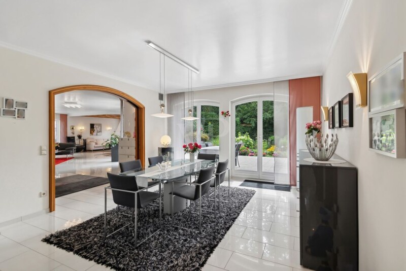 Welcome to the classic grace of Homburg. This first-class villa, built in 1986, sits majestically on a spacious plot of approx. 1,663 m² and impresses with its unique architecture. The well-thought-out design unfolds over two stylish levels with a living space of approx. 376 m² and also includes a basement with a shelter. The overall picture is complemented by a granny flat of approx. 70 m², which can be reached via a separate side entrance. Take a look at the video presentation of the exclusive villa: When you enter this villa, you are greeted by an impressive entrance that impresses with an elegant marble floor and a breathtaking ceiling height. The view of the open gallery reinforces the feeling of spaciousness. A custom-made arch leads you to the heart of the property: the impressive living and dining area of approx. 100 m². The open fireplace in the fireplace room provides cozy warmth and contributes to the cosy atmosphere, while large windows provide a harmonious view of the well-kept gardens. An adjoining winter garden merges the boundaries between inside and outside and offers the perfect place for a relaxed breakfast. The U-shaped kitchen, which is directly connected to the dining area, is equipped with high-quality electrical appliances and has an elegant marble worktop that offers the perfect setting for culinary delights. Separate from the living area is the sleeping wing as a private retreat. A dressing room leads into this area, which is complemented by a spacious master bathroom with walk-in shower and double sink. The bedroom completes this elegant area and offers a comfortable retreat. The imposing marble staircase with hand-crafted steel railings takes you to the next level of the villa's open gallery. Two branches lead from here: In the left and right wing you will find a bathroom, a bedroom and a living and studio area. Each wing also offers access to a loggia or a terrace with a wonderful view. These separate areas are ideal as guest or children's quarters. The basement offers, among other things, an in-house wine cellar where you can enjoy a glass of your own wine. A sauna and wellness area invites you to relax, while a shelter provides additional security. A total of three garage parking spaces are available for your vehicles and offer safe protection. The garage can be easily reached via the staircase with dry feet. Finally, you can enjoy the view of the idyllic gardens. The immaculately maintained lawn is framed by magnificent panicle and velvet hydrangeas as well as elegant grasses and perennials that give the surroundings a harmonious atmosphere. The spacious terrace invites you to linger not only on warm summer days, but also in the cooler seasons, as it is equipped with a cozy outdoor fireplace. This exceptional privacy creates a perfect retreat that invites you to relax and truly unwind. Immerse yourself in the atmosphere of this exclusive villa and discover your new home in the best location in Homburg. Arrange a viewing appointment today. This exclusive villa is located in one of the most sought-after residential areas in Homburg. The area impresses with its tranquility and green surroundings, which guarantee a high quality of life. Well-kept single-family homes and villas as well as spacious plots of land characterize the image of this renowned neighborhood. In addition to the location close to nature, you benefit from an excellent infrastructure with schools, shops and medical facilities in the immediate vicinity. The district and university town of Homburg is located in eastern Saarland and is the center of the Saarpfalz district and the gateway to the Bliesgau biosphere region. Homburg is a city full of energy and life. Above all, the residential and leisure value of our city is highly valued. In Homburg's city center there are also numerous other restaurants and leisure options. In just a few minutes you can reach the A6 motorway connection towards Mannheim/Saarbrücken or the A8 motorway Neunkirchen/Pirmasens. Homburg main station, where both local and long-distance trains stop, can also be reached within a few minutes by car or bicycle. - Main house approx. 376 m2 living space - Granny flat approx. 70 m2 living space - Open gallery - high-quality marble floors - high-quality parquet floors - Winter garden - Sauna - Fireplace room and outdoor fireplace - Wine cellar - Shelter - Alarm system - Loggia & balcony - two terraces - Double garage for three cars - Spacious garden area An energy requirement certificate is available. This is valid until August 30, 2034. Final energy requirement is 126.74 kwh/(m²*a). The main energy source for heating is oil. The year the property was built according to the energy certificate is 1986. The energy efficiency class is D. MONEY LAUNDERING: As a real estate agency, von Poll Immobilien GmbH is obliged according to Section 2 Paragraph 1 No. 14 and Section 11 Paragraphs 1 and 2 of the Money Laundering Act (GwG) to establish and verify the identity of the contractual partner when establishing a business relationship, or as soon as there is a serious interest in implementing the property purchase contract. To do this, it is necessary that we record the relevant data from your ID card (if you are acting as a natural person) in accordance with Section 11 Paragraph 4 GwG - for example by means of a copy. For a legal entity, we require a copy of the commercial register extract, which shows the beneficial owner. The Money Laundering Act stipulates that the agent must keep the copies or documents for five years. As our contractual partner, you also have a duty to cooperate in accordance with Section 11 Paragraph 6 GwG. LIABILITY: We would like to point out that the property information, documents, plans, etc. we pass on come from the seller or landlord. We therefore do not accept any liability for the accuracy or completeness of the information. It is therefore the responsibility of our customers to check the property inf