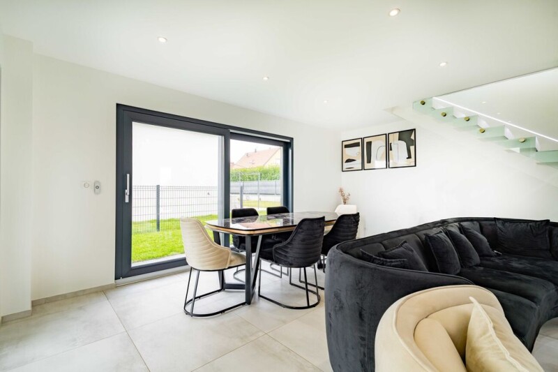 BRUMANI | Detached house in Bauhaus style with comfortable furnishings in Breisach am Rhein Obersaasheim (French: Obersaasheim) is a small municipality in the Haut-Rhin department in the Grand Est region in eastern France. It is located near the German border, about 5 km west of the Rhine, embedded in a rural, agricultural environment. The village is characterized by a quiet, idyllic location with traditional half-timbered houses, extensive fields and green spaces. The surrounding area is characterized by farmland, orchards and small forests, which gives Obersaasheim a natural atmosphere. The departmental road D52 runs through the village, which offers good connections to the surrounding villages. There are small shops, a church and local facilities for daily needs nearby. Obersaasheim is located in Alsace, a historically and culturally important region in eastern France, near the border with Germany and Switzerland. It is located around 25 km southwest of Colmar, the next largest city with economic, cultural and infrastructural importance for the region. The municipality benefits from its proximity to the A35, one of the most important north-south traffic axes in Alsace, which provides a fast connection towards Strasbourg (north) and Basel (south). The German-French border is only a few kilometers away, which gives commuters easy access to German cities such as Breisach am Rhein or Freiburg im Breisgau (approx. 30 km away). In addition, the EURO Airport Basel/Mulhouse/Freiburg is only 50 km away, which allows quick connections to international destinations. In addition, Obersaasheim is close to the Rhine Lateral Canal, which also makes the region attractive for water sports and leisure activities. The economic structure is characterized by agriculture, viticulture and smaller commercial enterprises, while larger employers and industrial centers can be found in the surrounding cities. In 7 minutes to Breisach am Rhein (Germany): Live where others vacation and work in Germany. This luxurious single-family home (built in 2022) makes it possible to commute in a short distance and finally move into your own dream property! The municipality of Obersaasheim is just a stone's throw from Breisach. This energy-efficient single-family home was built in the Bauhaus style in the residential area. This modern single-family home in Obersaasheim in Alsace/France combines the highest level of living comfort with well-thought-out architecture and high-quality furnishings. With spacious rooms, luxurious details and energy-efficient construction, it offers the perfect living space for families or couples. The house impresses with a very high-quality, custom-made kitchen, which is equipped with an integrated fully automatic coffee machine and a drinking water treatment system. The open living and dining area impresses with high ceilings and large windows, which ensure a particularly bright and friendly atmosphere. The individual, high-quality tile design runs through the entire house, while 16 mm VSG safety glass parapets set elegant accents. The spacious layout includes three bedrooms, a practical storage room and an additional guest toilet. The master bathroom is luxuriously equipped with a modern rain shower, a double sink and an illuminated mirror, which offers the highest level of comfort. The smart home technology enables the control of the electric roller blinds and the garage door, while dimmable LED spot installation ensures a pleasant lighting atmosphere in all rooms. The spacious outdoor area includes a covered terrace with integrated LED spots that invite you to relax and linger and a buildable roof area of approx. 30 m² on the upper floor. Thanks to high-quality triple-glazed plastic windows and 16 cm thick thermal insulation, the house is particularly energy efficient. The family-friendly environment offers an excellent infrastructure with kindergartens, primary schools and shops in the immediate vicinity. Extensive green areas and leisure opportunities in nature ensure a high quality of life. We are happy to provide you with further information or a viewing! Location: •Only 7 minutes drive across the Rhine to Breisach, Germany •Perfect combination: Working in Germany, living in Alsace Highlights: •High-quality, custom-made kitchen with integrated coffee machine (optional) •Drinking water treatment system (optional) •Open living and dining area with large window fronts, partly over both floors •Floating staircase to the upper floor •Energy efficiency class A •Electric underfloor heating Kitchen: •Kitchen island with sink and stove •Seamless kitchen cabinets that visually merge with the walls (kitchen optional) Ground floor: •Master bedroom with glazed bathroom en suite (rain shower, double sink, illuminated mirrors) •Integrated dressing closet •Guest toilet •Direct access to the tiled garage (ideal in bad weather) •Covered house entrance Upper floor: •Gallery with glass railings, conveys generosity & space •Bathroom with walk-in shower, double vanity •Two further bedrooms (one with Balcony) •Storage room •30 m² roof area can be expanded Outdoor area: •26 m² terrace (covered) •All living rooms and bedrooms face south •Garage parking space •Outdoor parking space Technology & comfort: •Smart home technology (control of electric roller shutters & garage door) •LED recessed spotlights •Triple-glazed plastic windows from Aluplast •16 cm thick thermal insulation (energy efficiency class) Surroundings & infrastructure: •Family-friendly environment •Kindergarten, schools, shops nearby •Close to the German border - perfect for commuters! Important information for your property viewing at BRUMANI Immobilien Let yourself be enchanted by the potential and uniqueness of our property offers! In order to make your viewing as personal and efficient as possible, we kindly ask you to send us your name and a TELEPHONE NUMBER at which we can reach yo