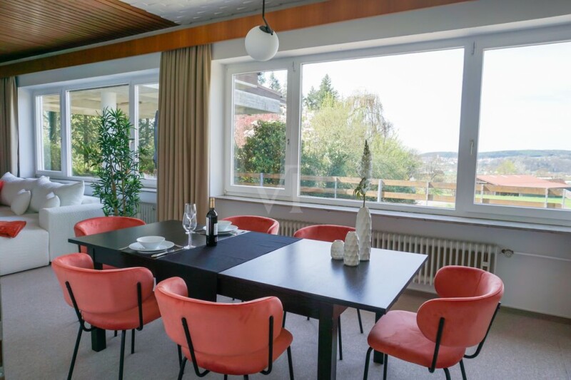 Welcome to your personal paradise! Peace, seclusion, and wonderful nature wherever you look. These are the qualities that make this unique property, with its unobstructed views and secluded location, captivate you. This two-family house in the elegant Bauhaus style offers endless possibilities for living and working on approximately 243 m² of living space. The impressive architecture will enchant you as soon as you enter the secluded front garden. Through the imposing canopy, past four majestic columns and the spacious terrace, you enter your new home. The spacious hallway divides the house into a west and east wing. The west wing houses the living area, while the east wing has been converted into modern offices. With just a few simple steps, this could be transformed back into a comfortable living space. A staircase leads straight ahead to the basement and the workshop. In the living area, the inviting guest room awaits you on the left, followed by the spacious living room. The almost 3-meter-high ceilings and the Bauhaus-style ceiling elements give the rooms a special touch and underscore the exclusive architecture. From the living room, you can access the large terrace and enjoy the breathtaking view. From the dining area, you reach the kitchen, which features a solid wood kitchenette and a breakfast table. Two spacious bedrooms, a practical storage room, a bathroom with a shower and bathtub, and a separate toilet perfectly round out the living area. The offices in this property offer four versatile office spaces, but this area can also be used as a separate apartment. Three offices are accessible from the entrance hall, and one office from the hallway. A modern, new kitchen and a cozy relaxation room provide additional comfort for employees. The offices offer versatile workspaces and space for individual work requirements and teamwork. Thanks to the fiber optic connection, you can stay up to date with the latest technology even in this idyllic setting. There is also a toilet and a bathroom here. The basement houses the workshop, boiler rooms, and storage rooms. The vestibule provides access to a toilet and direct access outside. The wide doors and ground-level entrance allow direct access to the area with pallets and other large items. The area can therefore safely continue to be used for commercial purposes. The central heating system, installed in 2003, provides cozy warmth in all rooms. The heat exchanger was replaced only in 2022. Some of the windows have already been replaced, and an Abus alarm system provides additional security. The property offers a generous 2,315 m² of space for garden enthusiasts and nature lovers. Behind the house are fruit trees and several mixed tree species. Here you can enjoy the idyllic oasis of peace surrounded by nature and spend relaxing hours outdoors. This two-family house is ideal for people seeking something special and wanting to combine living and working under one roof. The spacious floor plan, the secluded location with a wonderful view, and the high-quality furnishings make this property a truly unique property. Experience your new home – a place where dreams come true. Arrange a viewing today. We would be happy to provide you with a 360-degree tour. We look forward to meeting you! The property is located in a charming district of Nabburg. Nabburg impresses not only with its medieval old town, characterized by city gates, a city wall, a Gothic parish church, and a city museum, but also with a good range of shopping opportunities, medical care, and convenient rail connections. Visitors who explore historic Nabburg are immersed in the city's traditions, which span over 1,000 years. The old town sits majestically above the Naab River, and the picturesque streets and alleys invite you to linger. In addition to kindergartens, elementary and middle schools, Nabburg is home to the most important secondary schools. You can enjoy your free time at the Perschen leisure center with its water park or on long hikes in the beautiful surroundings. Culturally, Nabburg also contributes to an excellent quality of life with a cabaret stage, the famous medieval market, and a wide variety of events. The town has a direct motorway connection to the A93, which in just a few kilometers also leads to the A6 motorway junction with the Paris-Prague axis. This ensures fast and convenient access to all major surrounding regions. The excellent transport links and first-class quality of life offer excellent location factors with diverse opportunities for existing companies as well as for future relocations. - Large terrace with distant views - Ground-level access to the workshop with private restroom - 3-meter-high ceilings - Representative appearance - Two spacious apartments on one level - Abus alarm system for your security - Secluded location - Secluded property - Fiber optic connection. An energy performance certificate is available. This is valid until May 23, 2034. The final energy consumption is 206.00 kWh/(m²·a). The main energy source for heating is gas. The year of construction of the property according to the energy performance certificate is 1971. The energy efficiency class is G. Final energy consumption: 206.00 kWh/(m²·a).