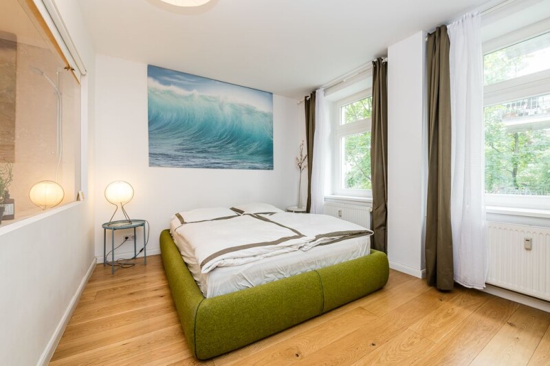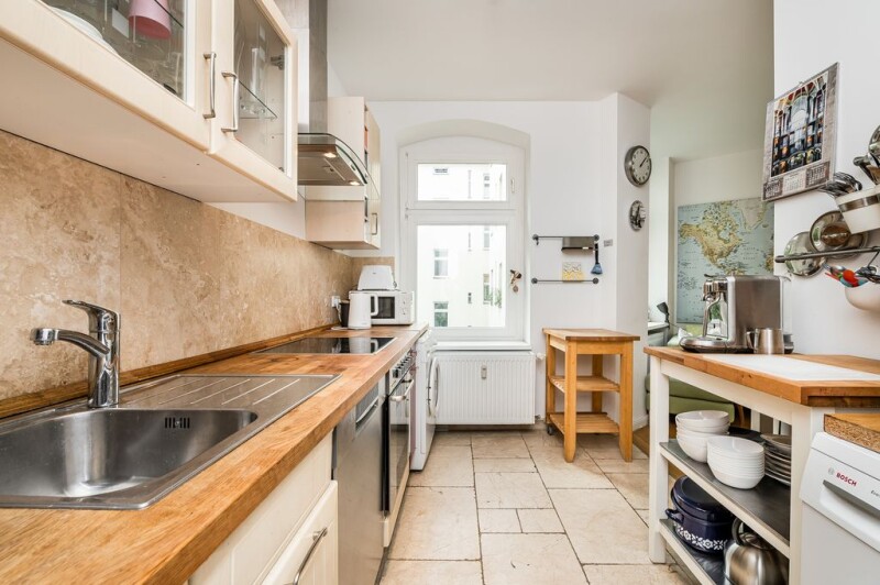 Modernly designed old building apartment in a prime location in Prenzlauer Berg Prenzlauer Berg is currently one of the most sought-after residential areas in the city center. The district embodies a very unique lifestyle, characterized by people who are hip, open and trendy. It embodies an unusually high diversity of cultural offerings, which are geared to the different origins, interests and needs of its residents, and it embodies a very special liveliness, which is characterized by the joy of life that is consciously lived out on the street. Many new Berliners live in generously renovated old buildings, some of which were built as far back as the mid-19th century - not only from all over Germany, but from all over the world. As a result of social change, an art, restaurant and bar scene that meets international standards and extends to the popular Mauerpark has established itself in the legendary neighborhoods around Helmholtzplatz and Kollwitzplatz. The Nordic Quarter, the Gleimviertel, the Blumenviertel, the Winsviertel and the Bötzowviertel have also developed into sought-after residential areas within the district, particularly for young people between the ages of 20 and 45. In addition to a well-developed road network, residents have access to five S-Bahn stations alone, as well as many bus and tram lines, which allow easy and quick access to all other areas of the city. The modern 3-room apartment in an old building in a sought-after neighborhood location impresses with its numerous attractive features. The apartment consists of three spacious rooms, including two bedrooms, which provide plenty of space for your individual needs. The modern bathroom has a large bathtub and a light cutout, ideal for relaxing after a long day. There is also a shower room with a luxurious rain shower, which combines the highest level of comfort and modern equipment. The spacious kitchen is equipped with a practical built-in kitchenette and offers plenty of space for cooking and socializing. The laid parquet floor in a country house plank look combined with the filled walls gives the apartment a warm and inviting atmosphere. The double-glazed plastic windows ensure efficient thermal insulation and a quiet living environment. The apartment is available immediately, so that you can move in quickly. A practical storage room offers additional storage space for everyday items. The floor plan of the apartment is extremely practical, which allows for flexible use of space. The ceiling height of up to around 3.60 meters gives the property a spacious feeling and conveys a very special kind of living. An assigned basement compartment completes the offer. Overall, this 3-room old building apartment in the sought-after Helmholtzkiez is a fantastic property that combines modern living comfort and attractive furnishings. • 3 rooms • 2 bedrooms • Modern bathroom with bathtub and light cutout • Shower room with rain shower • Spacious kitchen with a built-in kitchen unit • Parquet flooring in country house plank look • Filled walls • Double-glazed plastic windows • Available for immediate occupancy • Storage room • Practical floor plan • Ceiling height up to approx. 3.60 meters • Allocated cellar compartment • Bicycle parking spaces in the courtyard.