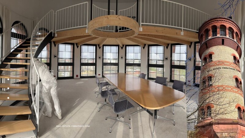 The former water tower for sale stands on a plot of approx. 490 square meters in the Medienpark. Built in 1904, the tower was used by an advertising agency until a few years ago, which converted it to suit its commercial needs. On the ground floor there is a friendly reception area made of steel profiles and glass. The tower base is made of solid sandstone. The tower was built in reinforced concrete and clad with clinker bricks. The view and overview from the upper floors is impressive. The top of the tower with the large meeting / conference room has a breathtaking all-round panoramic view and offers views in every direction. There are 6 floors - four of which have an additional mezzanine floor as a gallery. All floors and mezzanines are accessible via a spiral staircase in the center of the tower. An elevator is also available. However, the cultural monument is not only suitable as an office. Various ideas can be implemented with minor changes. By converting the WC in the tower head into a fully-fledged bathroom, for example, the upper floors can also be used as an unusual and prominent living space. Planning permission has already been granted to change the use of the office space on the 5th and 6th floors to a company apartment. There are 3 outdoor parking spaces on the grounds of the tower and further parking spaces on the large parking lot of the media site directly next to the historic water tower. REFINING & AWARDS Energetically refined by Real Estate Vibrations and awarded various seals of quality by the V.I.B.E.S. Institute for its good energy and high vibration (Good Vibes - Clear Vibes & Luxury Vibes) see //Institute.real-estate-vibrations.com BROKER'S COMMISSION: If successful, the buyer pays a buyer's brokerage commission of 3% + VAT.