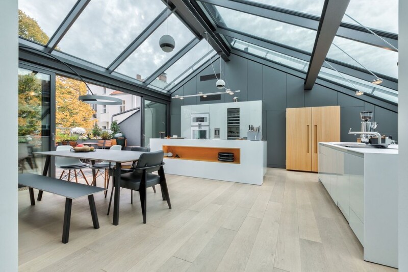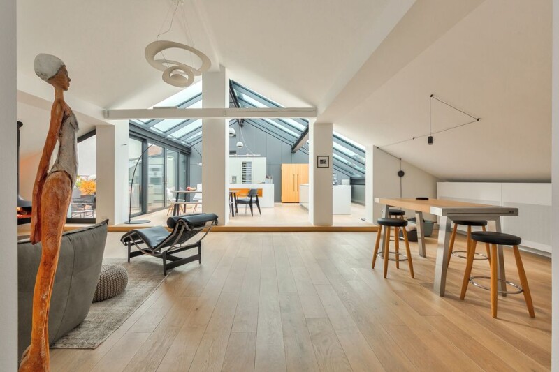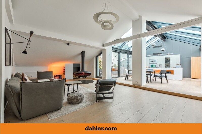 Architect's penthouse with an exquisite design concept Steglitz succeeds like no other district in building a harmonious bridge between the sophisticated life of a metropolis and the bourgeois reserve of the outlying districts. Cosmopolitan shopping malls, high-class hotels, famous cinemas and theaters harmoniously coexist with dreamy locations, cozy restaurants and quiet side streets in the district that belongs to the dual district of Steglitz-Zehlendorf. Depending on the residential area, the cityscape is characterized by stately old buildings, apartment buildings newly built as part of the reconstruction, as well as single-family homes and villas, some of which adorn spacious front gardens. Cultural institutions such as the "Schwarzsche Villa" on Grunewaldstrasse or the Schlosspark Theater offer their entertaining programs, cafés and restaurants their delicacies, and specialists from all medical disciplines their medical services. Kindergartens and schools, including four high schools, an adult education center and an art school, provide a comprehensive range of educational opportunities. Schlossstrasse, with its three huge shopping malls, is one of Berlin's most popular shopping streets. In addition to the underground and suburban railway, numerous day bus lines as well as metro, night and express bus lines run through the entire residential area. The local public transport network not only connects the individual locations with each other, but also enables easy access to Berlin city center and all other areas of the capital. In a historic old building from 1914, you will find a completely modernized 5.5-room penthouse apartment with the highest living standards, combining luxurious charm with contemporary comfort. This unique property conveys the flair of modern luxury living on approximately 253 square meters. The heart of this apartment is the spacious living and dining area, from which you can go directly into the fully glazed kitchen area with direct access to the sun terrace. The kitchen and living/dining area as well as all other rooms are fitted with elegant 22 millimeter oak parquet flooring. Another highlight is the rotating fireplace from Gyrofocus, which not only gives the entire area warmth, but also a timelessly elegant atmosphere. The glazed roof above the kitchen and dining area floods the penthouse apartment with natural light, while the integrated sun protection ensures a pleasant atmosphere on warm summer days. The room lighting is from Occhio and various designer furniture sets accents in each room, which can be purchased for an additional purchase price of 200,000 euros. The spacious master bedroom has a stunning en-suite bathroom, which is equipped with a modern walk-in shower with a waterfall effect and a stylish freestanding bathtub from Villeroy & Boch. Three further rooms are flexibly available as bedrooms, children's rooms and/or guest rooms, complemented by another bathroom with another walk-in shower. Another room with a glazed wall can serve as an office, which is located in the entrance area. Opposite there is a utility room, which is equipped with an additional kitchen. The entire ambience of the apartment is perfect thanks to a successful modernization, with an air conditioning system and the Sonos Home Sound System ensuring contemporary comfort in all rooms. The option to install a sauna underlines the pursuit of well-being. The apartment has a separate entrance that is also suitable for commercial use options. This unique penthouse apartment in a carefully modernized old building offers a perfect symbiosis of history and modern luxury and invites you to experience the unique flair of this residential jewel. • 5.5 rooms • 1 master bedroom with en-suite bathroom (includes walk-in shower with rain shower effect and bathtub) • Three additional rooms (can be used as a bedroom, children's room and/or guest room) • 1 shower bathroom (with walk-in shower with rain shower effect) • Bulthaup kitchen cabinets with Gaggenau appliances • Utility room with integrated kitchen • 20mm oak parquet in the kitchen and living/dining area and in other individual rooms • 360 degree rotating fireplace from Gyrofocus • Glazed roof with integrated awning system over the kitchen and dining area • Skylights can be operated electrically and all windows have electric shading/darkening • All room lighting from Occhio • Designer furniture in all rooms worth 200,000 euros are to be taken over additionally • Built-in cupboards made of acoustic panels • Sonos Home Sound System in all rooms + Bose sound system including projector and screen & in the kitchen area Architettura Sonara Spherinar Air loudspeaker • Option for sauna installation • Separate entrance (option for commercial use).